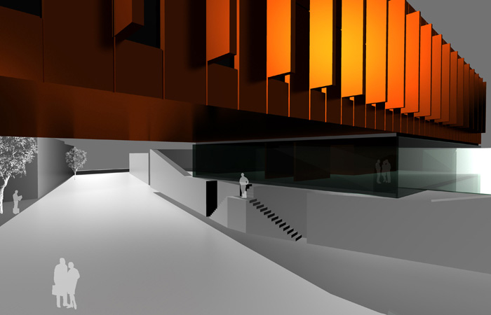 das science center wird so angelegt, das es das kastell nicht stört oder den blick zu sehr auf sich zieht. trotzdem ist es stark genug um sich ihm gegenüber behaupten zu können. die geschlossene optik des neuen riegels lehnt sich an die festungs-artige optik des kastells an und bildet dadurch eine einheit mit ihm. die über zwei geschosse reichenden fensterläden sind genau wie der rest der fassade aus kupfer und unterstreichen den massiven äusseren eindruck. sie sind jedoch perforiert und sind somit licht-durchlässig und bieten trotzdem einen herrvoragenden sonnenschutz.
