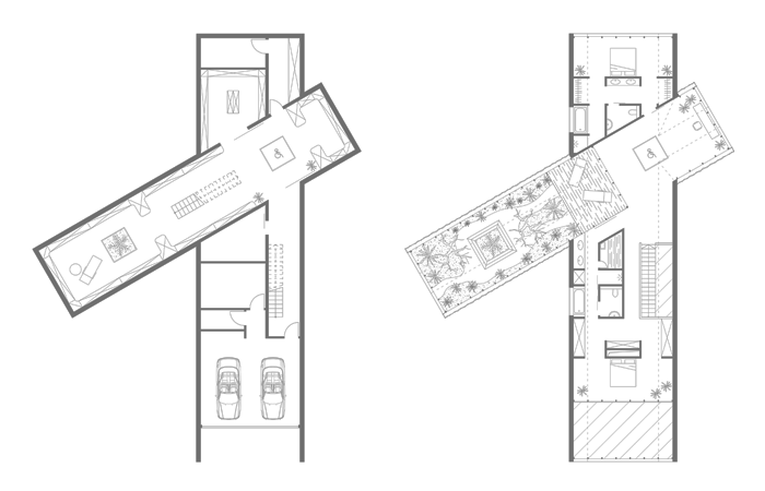 es wurden zwei unterschiedliche riegel entwickelt. der erste riegel steht für den beruf des bauingenieurs und nimmt daher die „urform“ des hauses auf - das satteldach. dieses satteldach gliedert sich auch sehr harmonisch in die umgebung vom baugebiet ein. in diesem riegel werden die grundlegenden funktionen des lebens aufgenommen. der zweite riegel verkörpert die gebürtige brasilianerin und wurde deswegen mit seiner giebelseite genau in richtung brasilien ausgerichtet. in diesem riegel werden die besonderen leidenschaften des paares aufgenommen und verbunden. um einen wesentlichen bezug zwischen den leidenschaften und den grundlegenden bedürfnissen zu schaffen, durchstößt dieser riegel den ersten.