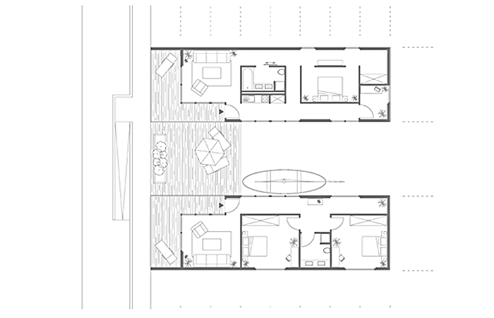 zum einsatz, das es erlaubt aus nur wenigen vorgefertigten bauteilen unzählige grundrissvarianten zu entwickeln. durch das format, dessen abmessungen mit denen eines üblichen containers identisch sind, bietet das konzept optimale transportmöglichkeiten mit schiff, bahn, lkw oder flugzeug. die elemente haben alle dieselbe größe, lassen sich vorfertigen und helfen dadurch kosten und energie zu sparen. um dem problem der wachsenden bevölkerung entgegen zu wirken, weicht dieses konzept auf das wasser aus und schafft somit neue lebensräume. die schwimmpontons bilden zu dritt gestapelt wieder genau das container format, um genauso transportabel zu sein wie die module selber. außerdem beherbergen sie die komplette haustechnik sowie ballast-tanks um die höhe des bodens der höhe der anlegestelle anpassen zu können.