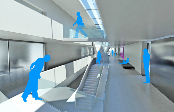 die grundidee besteht darin, die von uns gewählten hauptbereiche sport, wissen, kultur und ernährung in getrennten, zum wasser hin orientierten riegeln zu platzieren, die durch einen langen baukörper verbunden sind, der als "strasse der begegnung" fungiert. das eg sowie das 1.og des gebäudes werden komplett öffentlich sein und beherbergen die "+" angebote, wie das schwimmbad, die sporthalle, die bibliothek, das auditorium und die mensa. diese bereiche dienen nicht nur den schülern, sondern auch den anderen bewohnern der insel. so bietet die schule auch nach unterrichtsende ein weitreichendes angebot an aktivitäten und kann so den ganzen tag genutzt werden. im 2.og befinden sich die klassen-, die naturwissenschafts- und kunsträume. sie alle sind rund um einen innengarten angeordnet, der den schülern die möglichkeit bietet, sich innerhalb der klassenverbände im freien aufzuhalten, ohne dafür extra auf den großen schulhof zu gehen. das hat den vorteil, das die einzelnen altersstufen auch getrennt von einander ihren bedürfnissen nachkommen können, da nur zwei jahrgänge in jedem riegel untergebracht sind. zudem werden durch diese gärten die klassenräume von beiden seiten belichtet, was sie sehr offen und hell gestaltet.