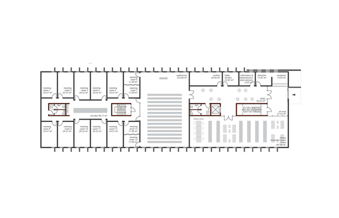 das science center wird so angelegt, das es das kastell nicht stört oder den blick zu sehr auf sich zieht. trotzdem ist es stark genug um sich ihm gegenüber behaupten zu können. die geschlossene optik des neuen riegels lehnt sich an die festungs-artige optik des kastells an und bildet dadurch eine einheit mit ihm. die über zwei geschosse reichenden fensterläden sind genau wie der rest der fassade aus kupfer und unterstreichen den massiven äusseren eindruck. sie sind jedoch perforiert und sind somit licht-durchlässig und bieten trotzdem einen herrvoragenden sonnenschutz.