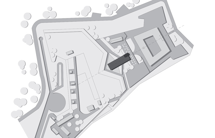 das science center wird so angelegt, das es das kastell nicht stört oder den blick zu sehr auf sich zieht. trotzdem ist es stark genug um sich ihm gegenüber behaupten zu können. die geschlossene optik des neuen riegels lehnt sich an die festungs-artige optik des kastells an und bildet dadurch eine einheit mit ihm. die über zwei geschosse reichenden fensterläden sind genau wie der rest der fassade aus kupfer und unterstreichen den massiven äusseren eindruck. sie sind jedoch perforiert und sind somit licht-durchlässig und bieten trotzdem einen herrvoragenden sonnenschutz.