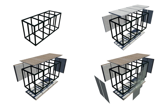 um auf die problemstellungen einzugehen wurde ein boxenprinzip entwickelt, welches neue möglichkeiten eröffnet um energie und kosten zu sparen und trotzdem ein ansprechendes äußeres zu bieten. im hier gezeigten boxenprinzip kommt ein raster zum einsatz, das es erlaubt aus nur wenigen vorgefertigten bauteilen unzählige grundrissvarianten zu entwickeln. durch das format, dessen abmessungen mit denen eines üblichen containers identisch sind, bietet das konzept optimale transportmöglichkeiten mit schiff, bahn, lkw oder flugzeug. die elemente haben alle dieselbe größe, lassen sich vorfertigen und helfen dadurch kosten und energie zu sparen. um dem problem der wachsenden bevölkerung entgegen zu wirken, weicht dieses konzept auf das wasser aus und schafft somit neue lebensräume. die schwimmpontons bilden zu dritt gestapelt wieder genau das container format, um genauso transportabel zu sein wie die module selber. außerdem beherbergen sie die komplette haustechnik sowie ballast-tanks um die höhe des bodens der höhe der anlegestelle anpassen zu können.