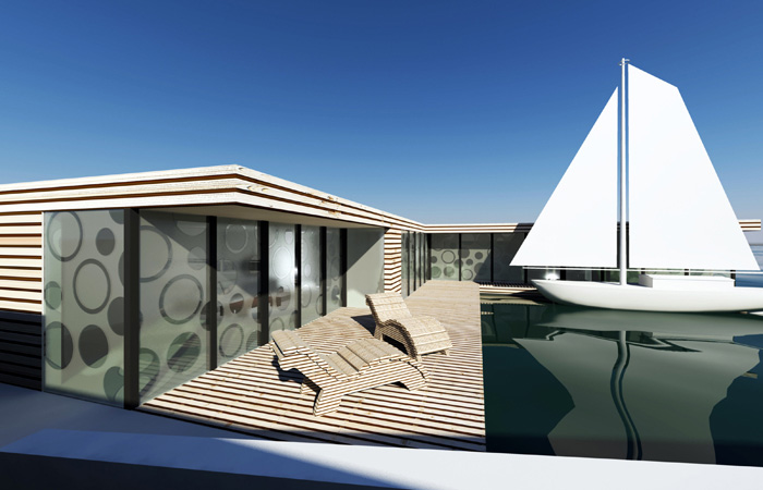 zum einsatz, das es erlaubt aus nur wenigen vorgefertigten bauteilen unzählige grundrissvarianten zu entwickeln. durch das format, dessen abmessungen mit denen eines üblichen containers identisch sind, bietet das konzept optimale transportmöglichkeiten mit schiff, bahn, lkw oder flugzeug. die elemente haben alle dieselbe größe, lassen sich vorfertigen und helfen dadurch kosten und energie zu sparen. um dem problem der wachsenden bevölkerung entgegen zu wirken, weicht dieses konzept auf das wasser aus und schafft somit neue lebensräume. die schwimmpontons bilden zu dritt gestapelt wieder genau das container format, um genauso transportabel zu sein wie die module selber. außerdem beherbergen sie die komplette haustechnik sowie ballast-tanks um die höhe des bodens der höhe der anlegestelle anpassen zu können.