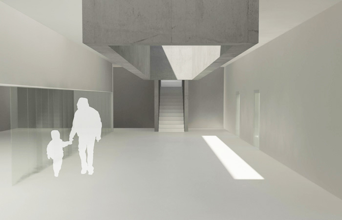 der neubau am grimmerhus in dänemark gestaltet sich hauptsächlich als unterirdische museumslandschaft, welche überirdisch durch einen "schaukasten" ergänzt wird. dieser "schaukasten" ist zur rückseite hin geschlossen und nach vorne sehr offen gehalten, so das die besucher schon aus dem skulpturengarten sehen können, welche kunstwerke in dieser "vitrine" ausgestellt sind. der unterirdische bereich wird lediglich durch oberlichter und kunstlicht belichtet, während sich das erdgeschoss weiter zum garten hin öffnet und nur durch eine wandscheibe von der äusseren umgebung getrennt wird. das obergeschoss hingegen öffnet sich komplett zum skulpturengarten und wird somit intensiv von tageslicht belichtet. so bildet sich ein rundgang der gänzlich unterschiedliche belichtungszonen besitzt, und das museum kann selber entscheiden welche kunstwerke bei welcher belichtung am besten zur geltung kommen.