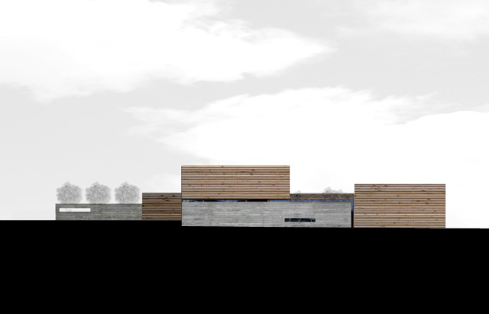 der kindergarten ist nach dem baukasten prinzip aufgebaut und besteht aus mehreren kuben, die ineinander verschachtelt sind und trotzdem ein homogenes äusseres bilden. die gruppenräume sind zur morgensonne ausgerichtet und bieten einen gruppeninternen rückzugsraum. auf ihrer rückseite befindet sich eine große halle, die den kindern als begegnungsfläche dient und auch für veranstaltungen genutzt werden kann. es wurde darauf geachtet das von innen möglichst viel grünraum zu sehen ist, so das das gefühl entsteht man wäre draussen in der natur. diesem aspekt folgt auch die materialwahl, welche verschiedene elemente der natur aufgreift, und so den kindern ein gefühl davon vermittelt, welche baustoffe wie eingesetzt werden können.