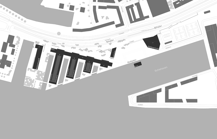 das konzept der SCHIEHAVEN_waterfront basiert auf zwei schwerpunkten. zum einen wollen wir das potential des lloyd multiplein als veranstaltungsort nutzen, zum anderen möchten wir den gewerbebereich in eine urbane lebenswelt umwandeln, die eine mischung von unterschiedlichen wohnformen sowie büroflächen beinhaltet. die museumswerft soll als kulturelle einrichtung in ihrer funktion erhalten bleiben. verbindendes element für das neue quartier SCHIEHAVEN_waterfront ist das leben am wasser. im bereich der wohn- und bürobebauung wird die kaikante durch neue „hafenbecken" erweitert, so dass aus allen nutzungseinheiten ein direkter bezug zum element wasser entsteht. der lloyd multiplein wird durch die neue bebauung gefasst und erhält mit dem veranstaltungszentrum einen abschluss nach osten. die viergeschossige zeilenbebauung im norden bildet städtebaulich das verbindungs-element der drei bereiche. der bereich des alten deichs wird als parkähnlicher grünraum umgestaltet. er wird teil eines größeren grünzuges, der sich entlang des westzeedijks bis zum stadtpark entwickelt.